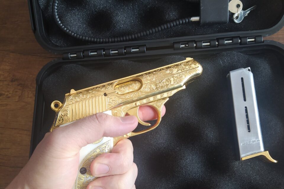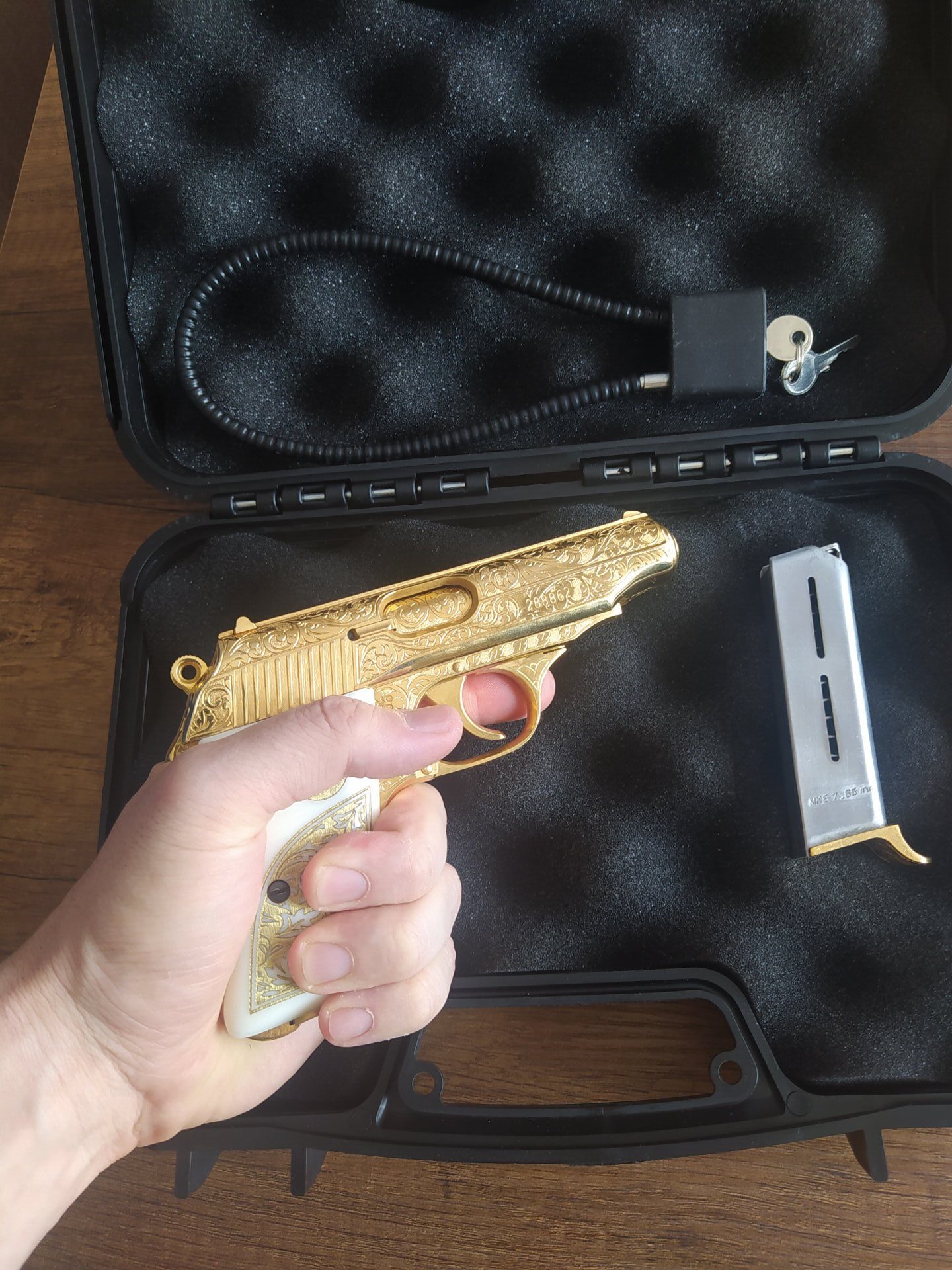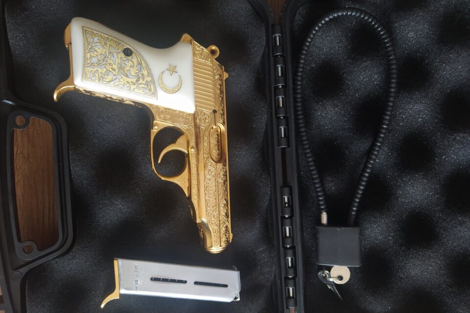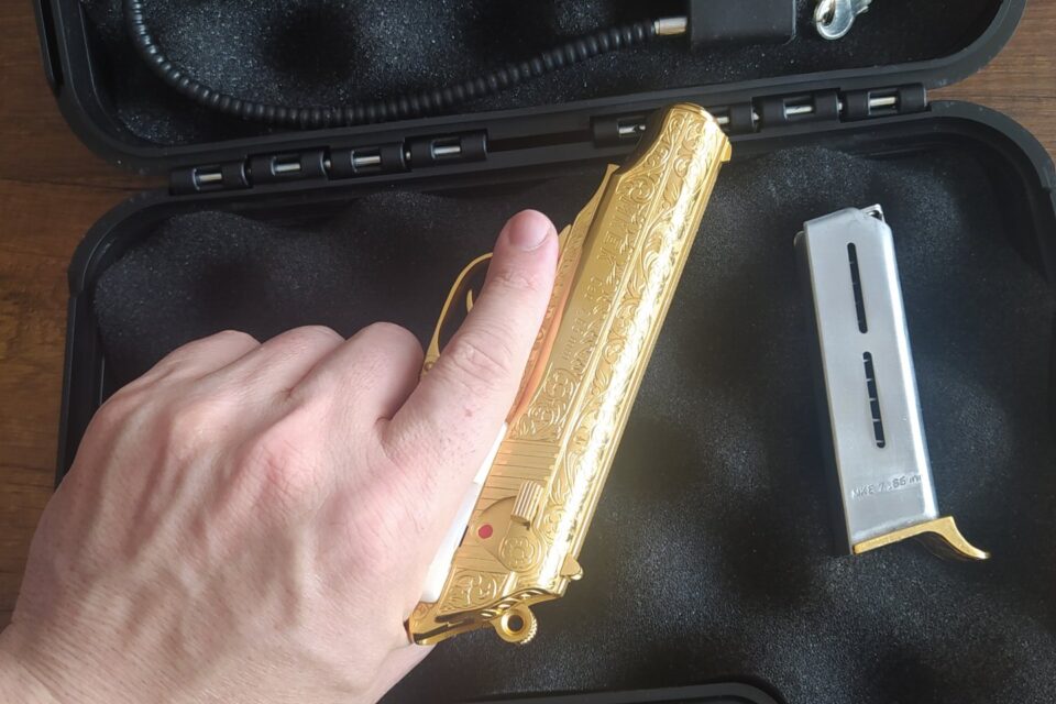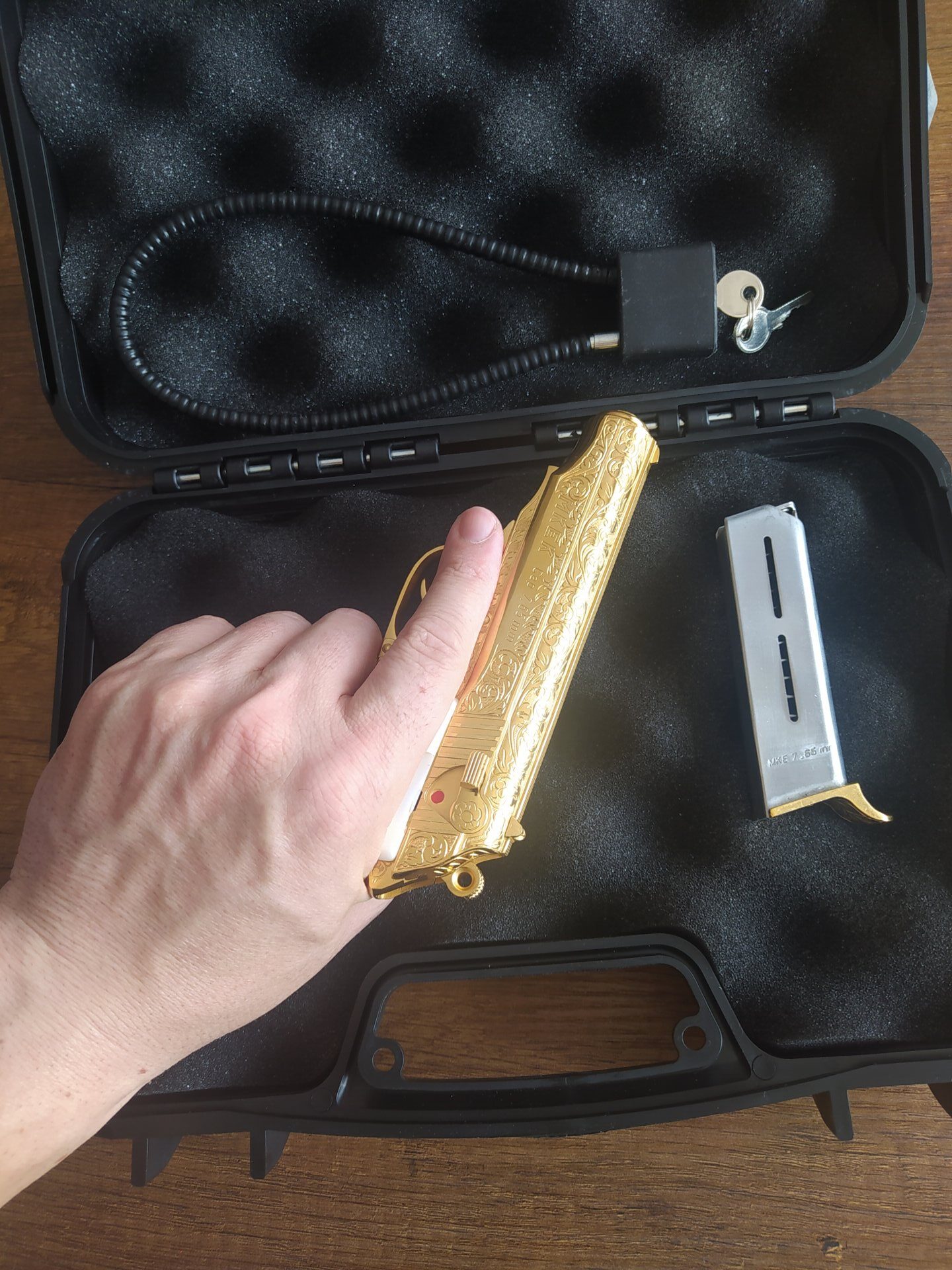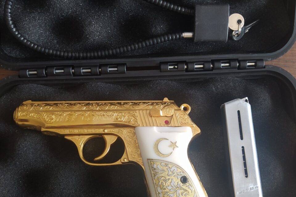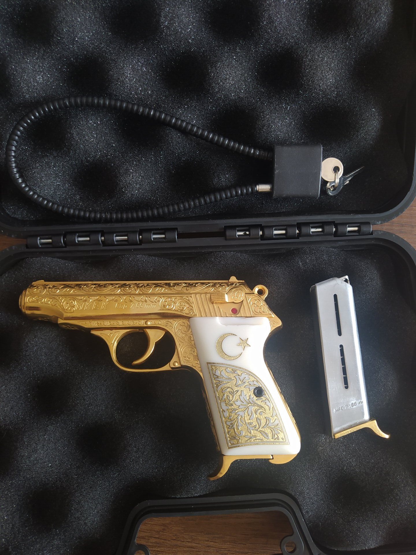 MKE de kalan son 3 altın kaplama tabancadan biriydi aldığım zaman. Ve sadece MKE poligonunda deneme atışı yapıldı. Kabzesi sedeftir özel yapım. Tamamı altın kaplama özel ve koleksiyonluk bir tabancadır.