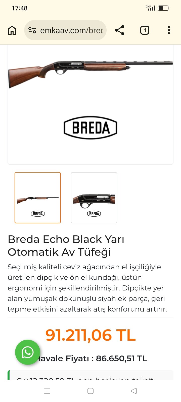 Breda Echo Black 71 cm namluya sahip, sıfır ayarında ve çok az kullanılmış bir av tüfeğidir. Çizik ve vuruk yoktur. Saçma dağılımı, öldürücülüğü ve grupmanı oldukça başarılıdır; Breda namlusunun kalitesini bilen bilir. 3020 gram net ağırlığıyla kinetik sisteme göre dengeli ve hafif bir tüfektir, tepme ve dikme yapmaz. İtalyan kalitesiyle uzun yıllar memnuniyetle kullanılabilecek bir modeldir.