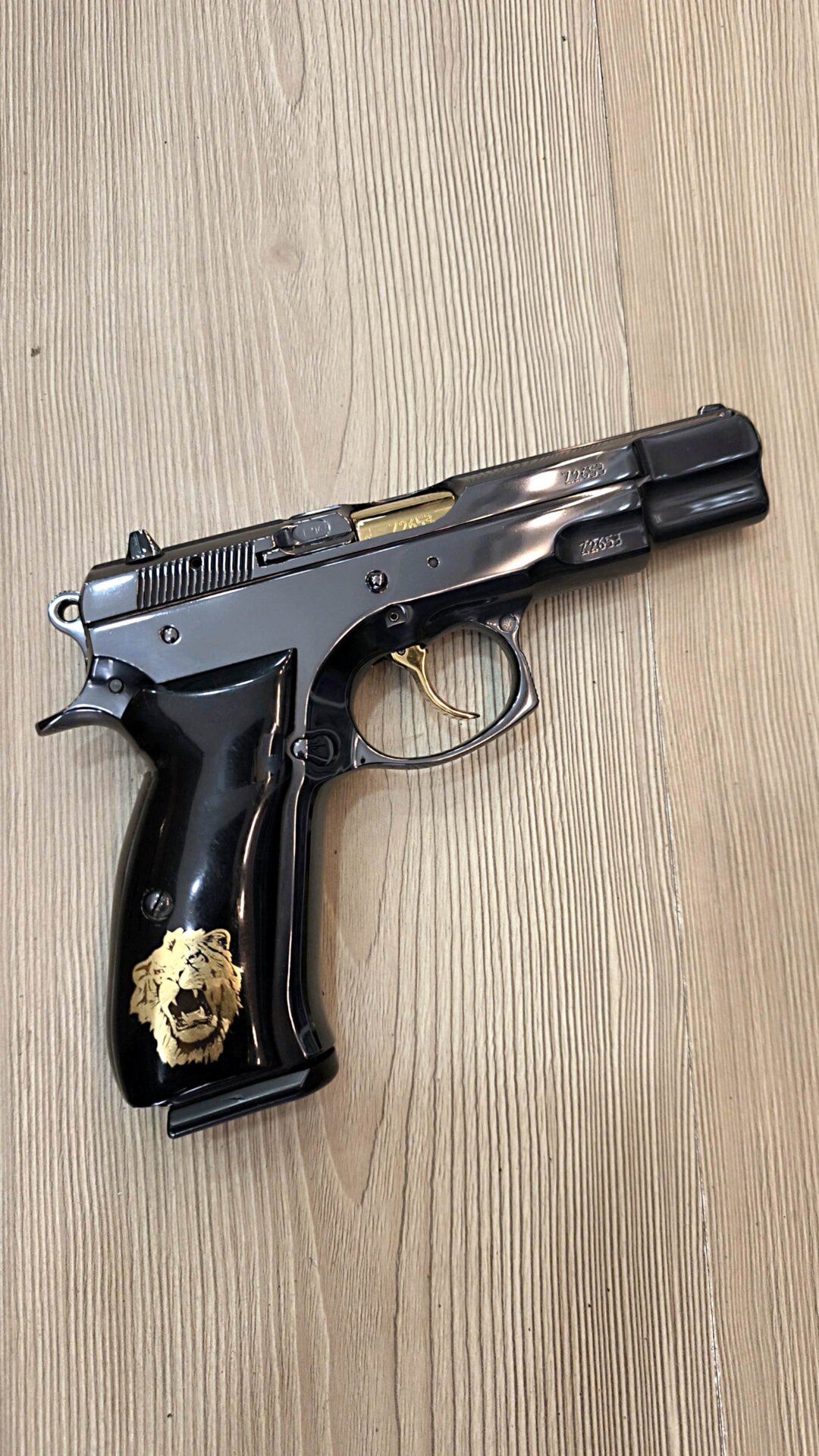 - Öne Çıkan Özellikler: Altın kaplama tetik ve namlu detayları, özel tasarım aslan figürlü parlak siyah kabze.