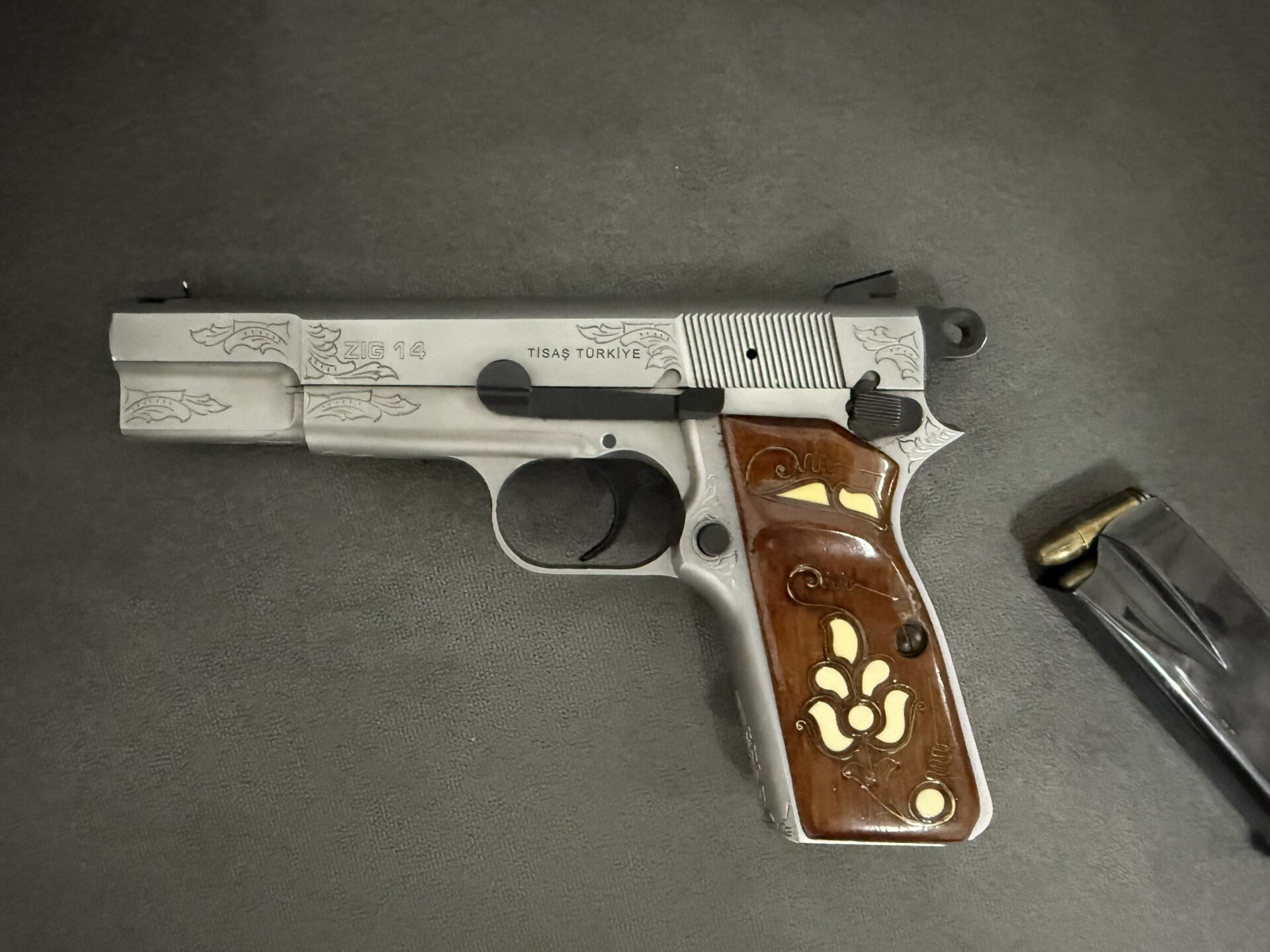 Zigana Inox Mat 14 gravürlü siyah tabancamı satıyorum. Silah oldukça bakımlıdır, herhangi bir mekanik sorunu yoktur. Atış performansı gayet iyidir ve kozmetik olarak da temiz durumdadır. Inox mat gövdesi ve gravürlü tasarımı sayesinde hem şık hem de dayanıklı bir modeldir.Aktif olarak toplasan 50-60 atış yapılmıştır.Yedek şarjör ve kutusu mevcuttur.