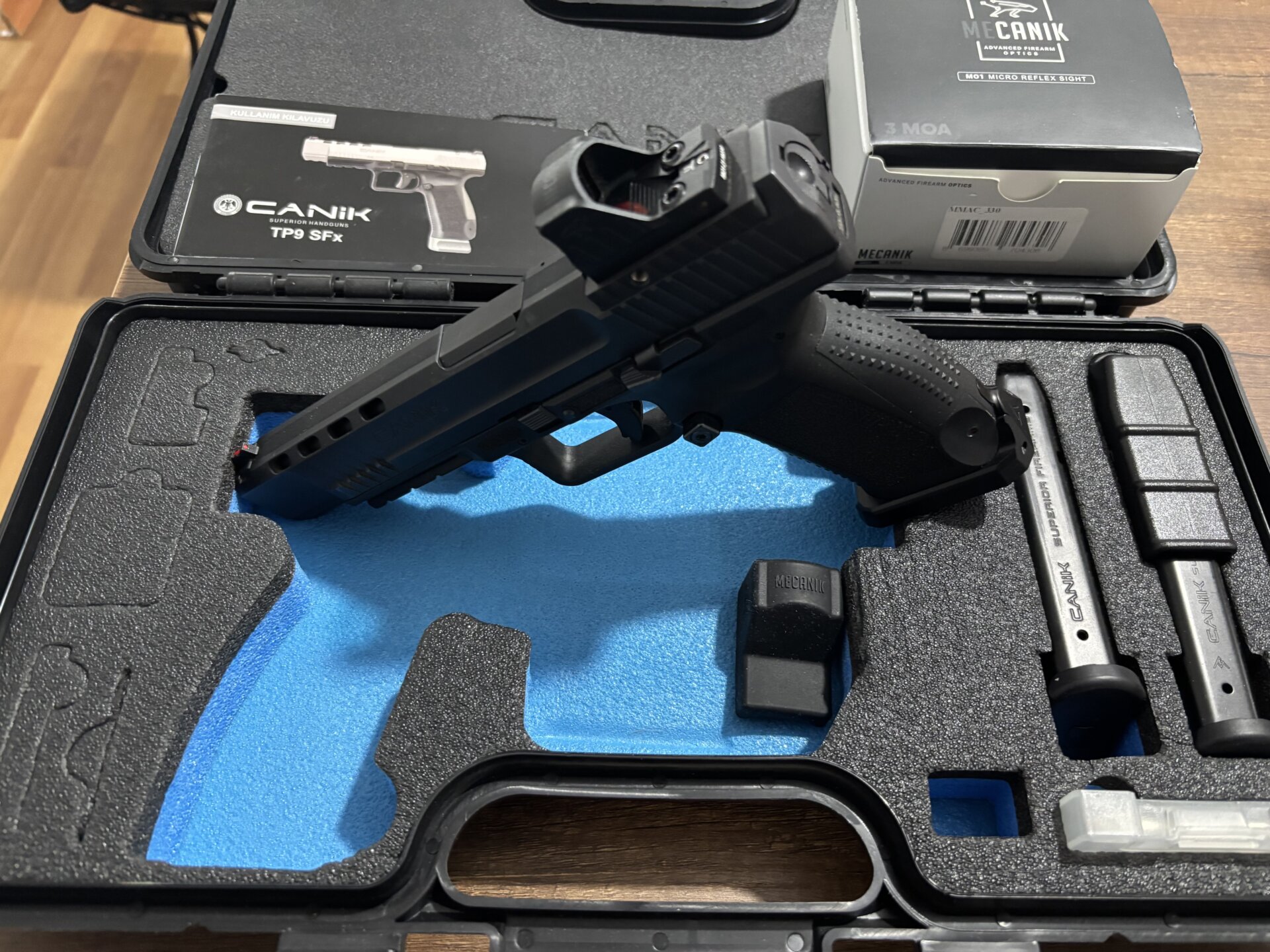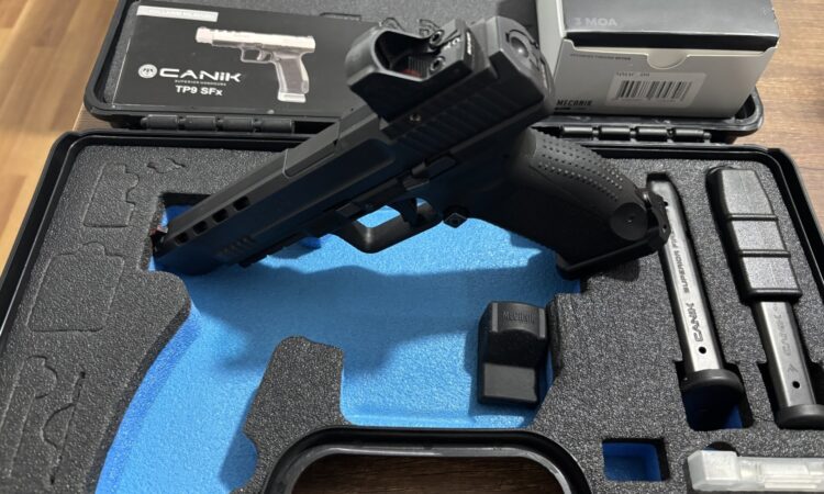 Sıfır ayarında Canik TP9 Sfx Reddotlu üzerinde magvel var ekstradan 1 şarjörü var toplamda 3 şarjör var Kolay fişek basma aparatı var.