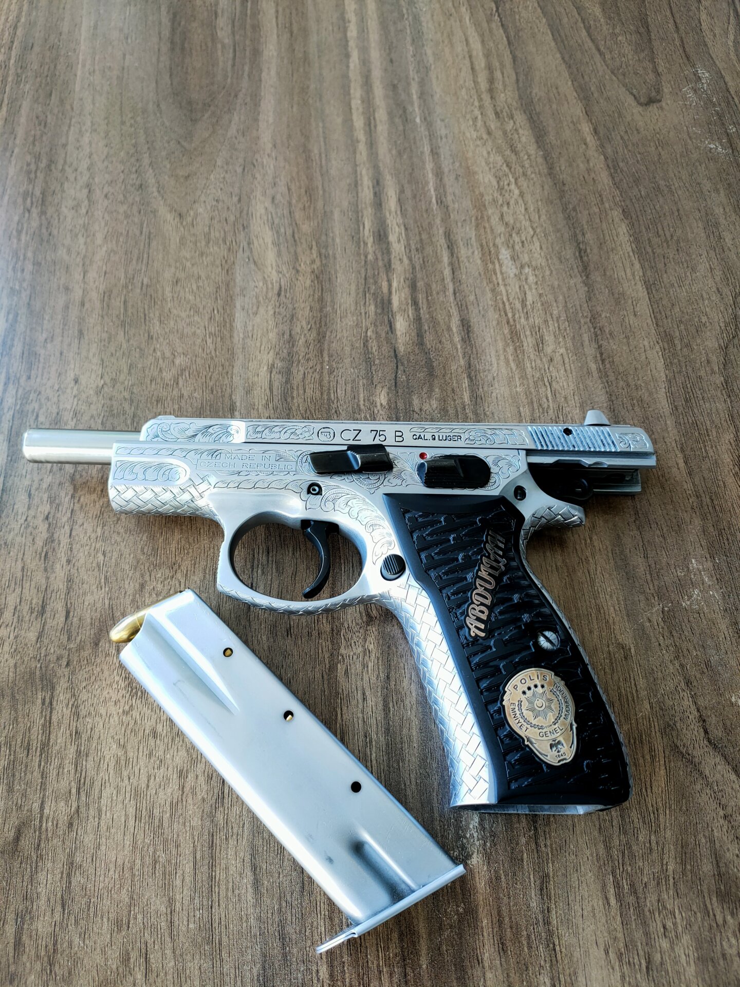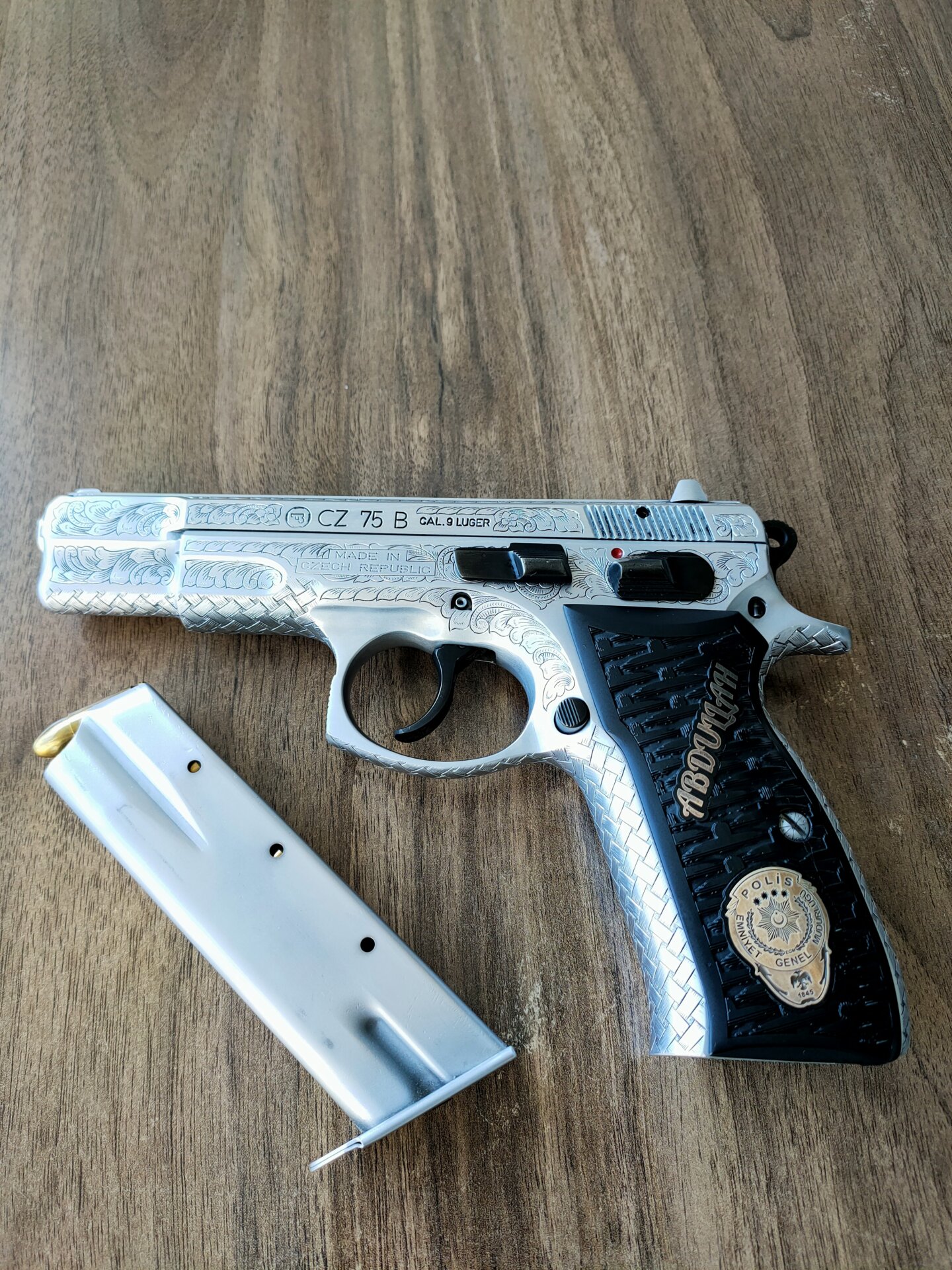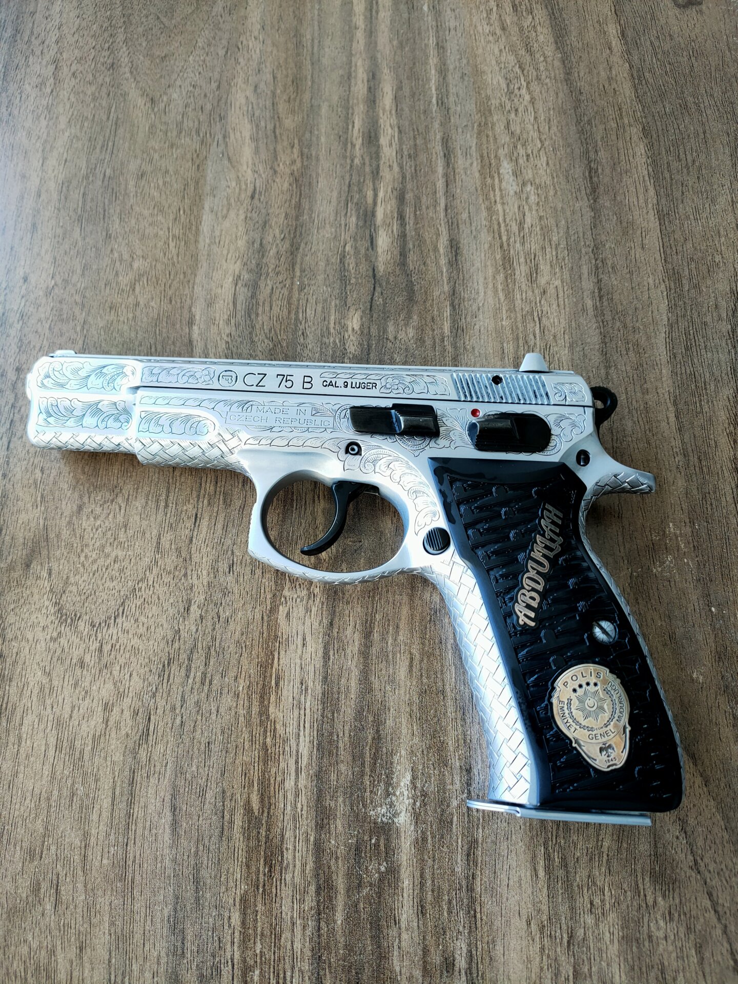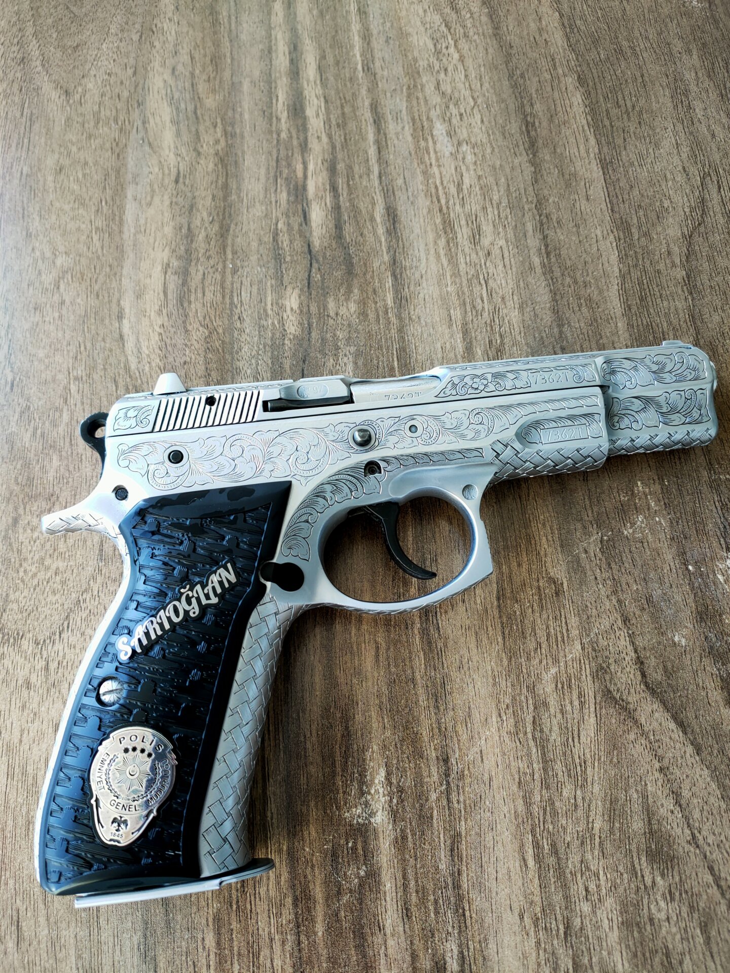 Tabanca Konya Huğlu da özel el işçiliği gravür yapıldı. Kabzede bulunan Polis armaları gümüş olup kabze özel yapımdır. Kısaca sıradan ilanlar ile kıyaslamayın. Kıymet bilen meraklı özel kişiler için. Yanında kılıfları ve bir kutuda mermi hediyesidir.