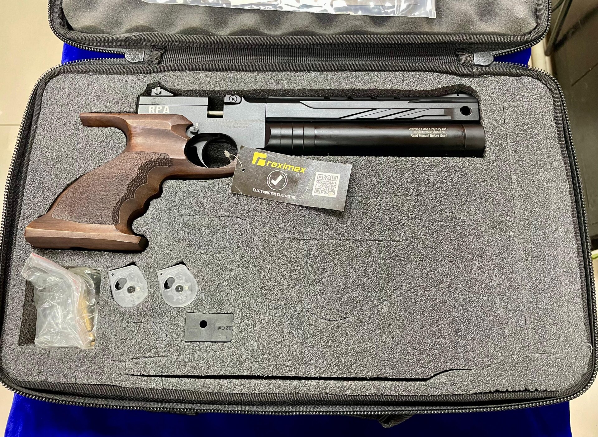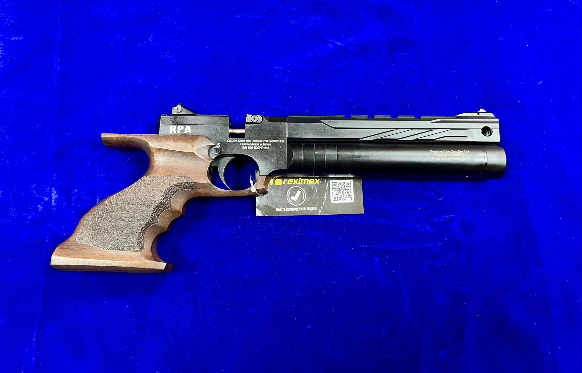 Reximex RPA 5.5 mm PCP havalı tabanca sıfırdır. Bayi faturası ile gönderim sağlanır ve karta taksit imkânı vardır. Yandan kurmalı sistemdir. 5.5 mm / .22 cal kalibreye, 7 şarjör kapasitesine, 157 m/s namlu çıkış hızına ve 14.5 joule enerjiye sahiptir. 250-100 bar aralığında optimum hızda yaklaşık 40 atış yapabilir. 50 cc sökülüp takılabilir alüminyum hava tüpü, 250 bar doldurma basıncı, Türk cevizi kundak, 330 mm genel uzunluk, 200 mm namlu uzunluğu ve 900 gram ağırlığa sahiptir. Standart regülatörlüdür.