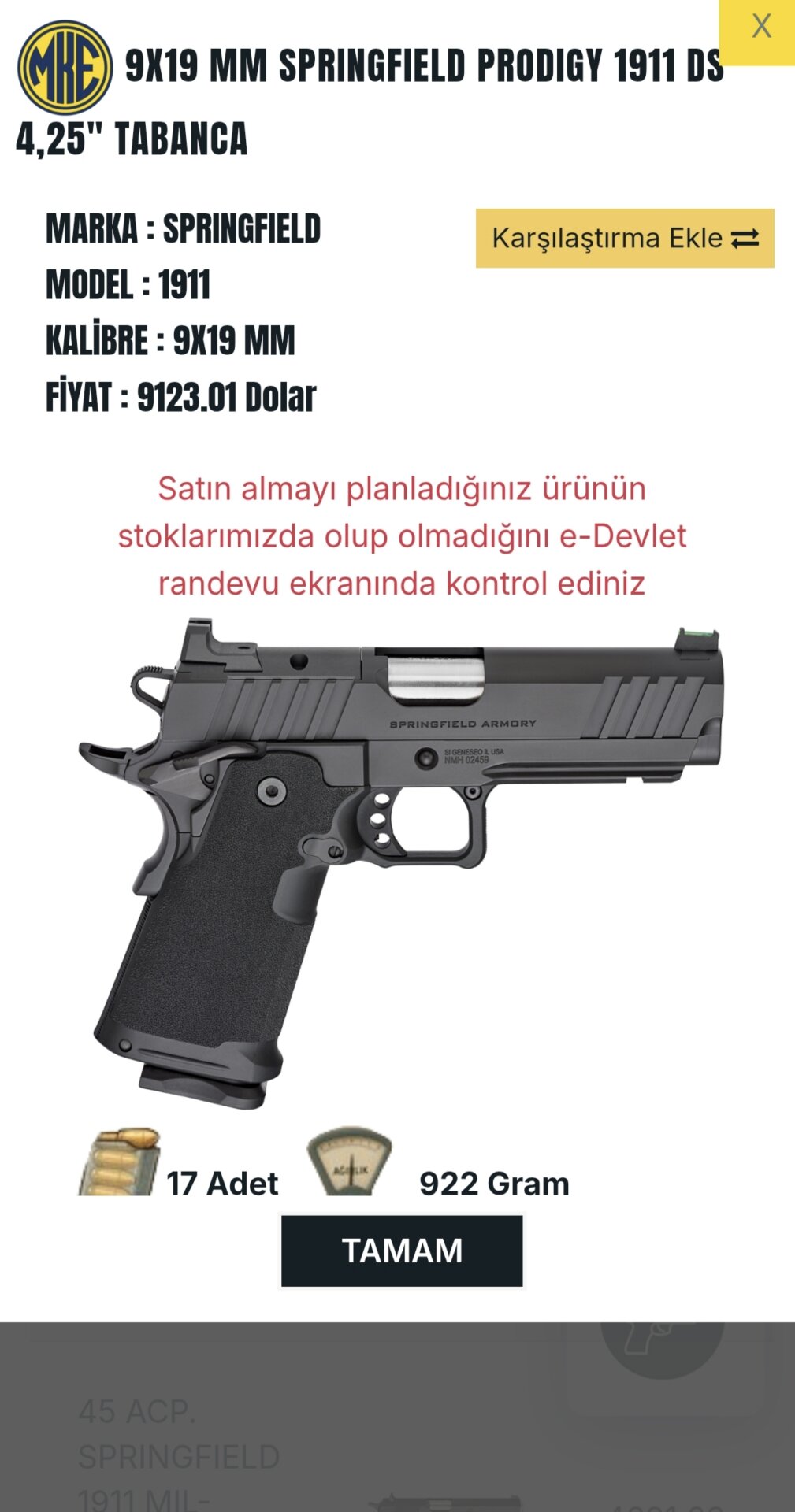 Silahım Amerika’nın en eski ve köklü silah fabrikası olan Springfield markasının prodıgy modelidir. 1911 double stack (2011) platformu dünyada çok popüler olan kasasidir 17+1 kapasitelidir.Silahın malzeme kalitesi ve işçiliği köklü üretim yılı ve tecburesini fazlasıyla size hissettiriyor gerçekten premium hissiyatı eline alan kişiye sunuyor. MKE satış fiyatı 9123 dolardır. Silahım fabrikasindan çıktığı gibi özenle muhafaza ediliyor ,tüm kutu içeriği ile teslim edilecektir, lütfen ruhsat işlemlerini tamamlamış kişiler irtibat kursun ,yeni alıcısına hayırlı olsun..