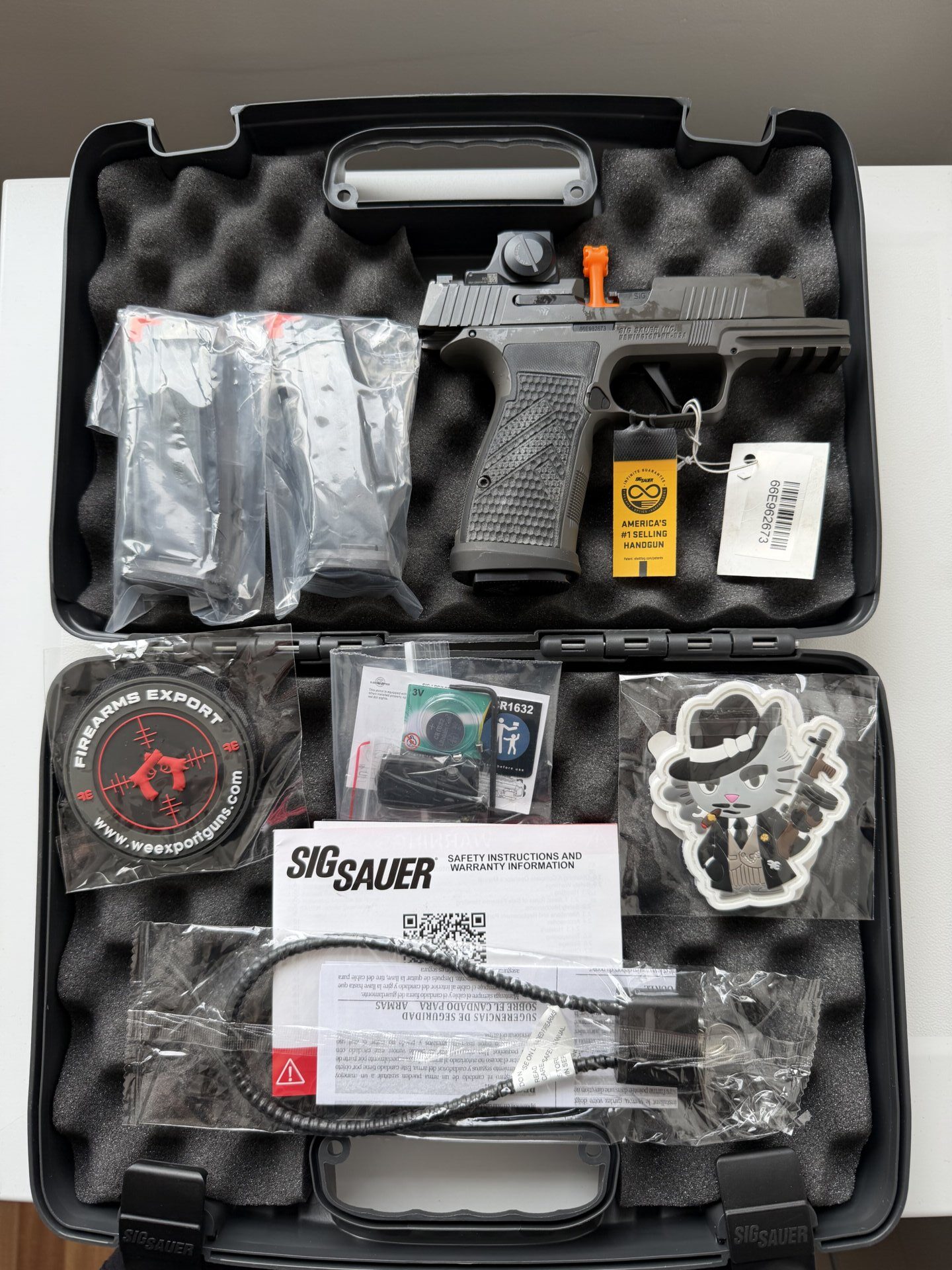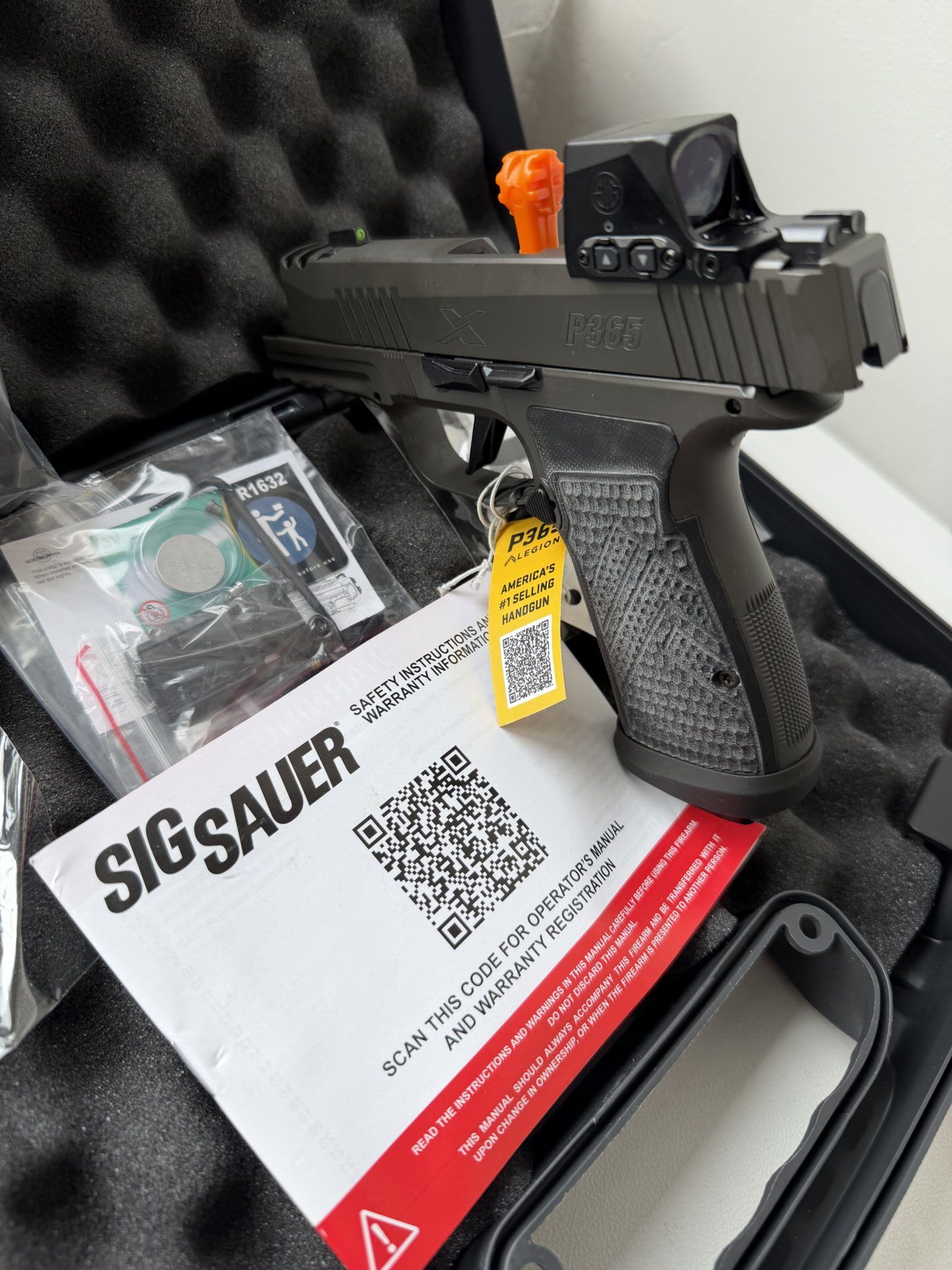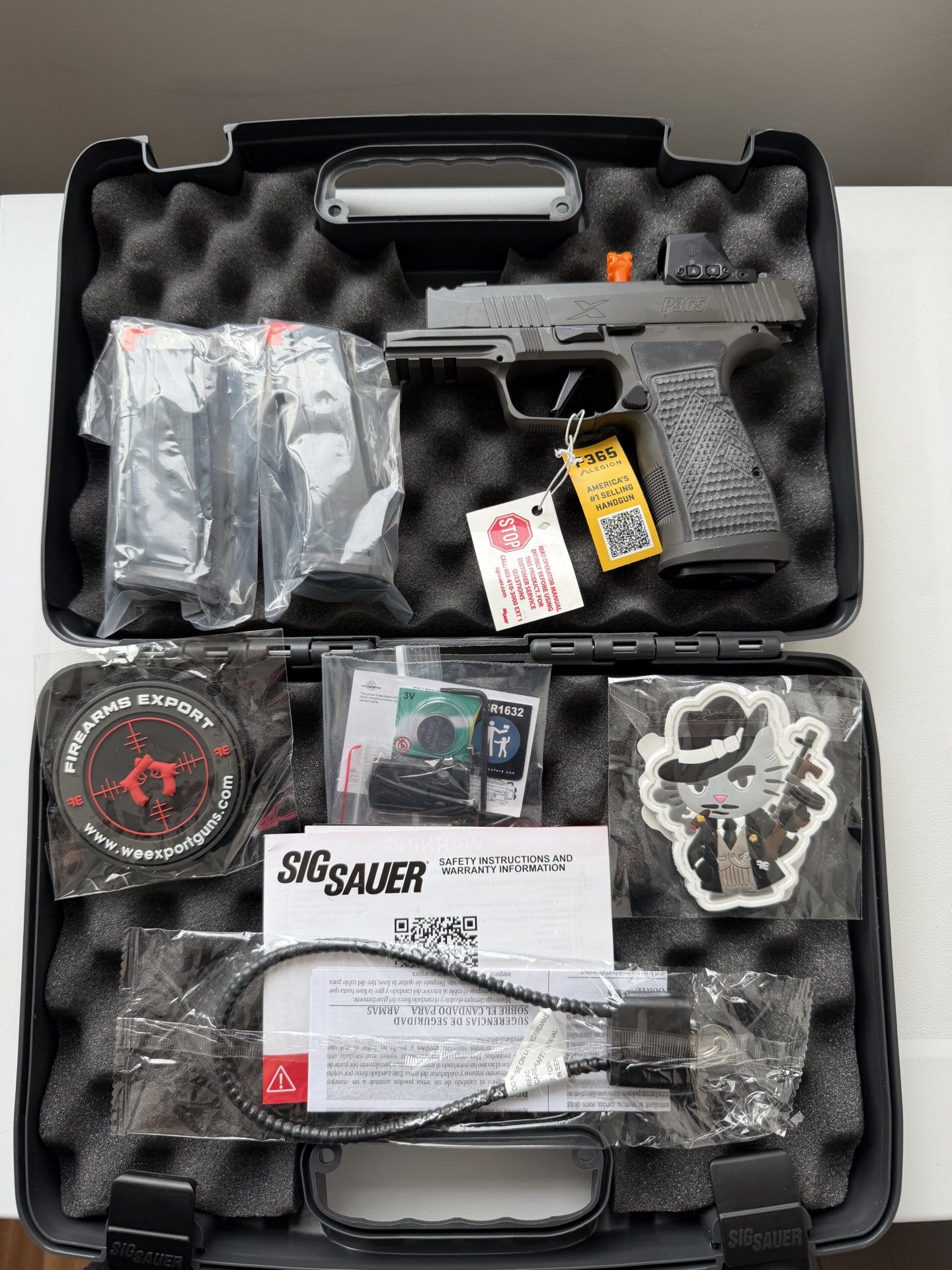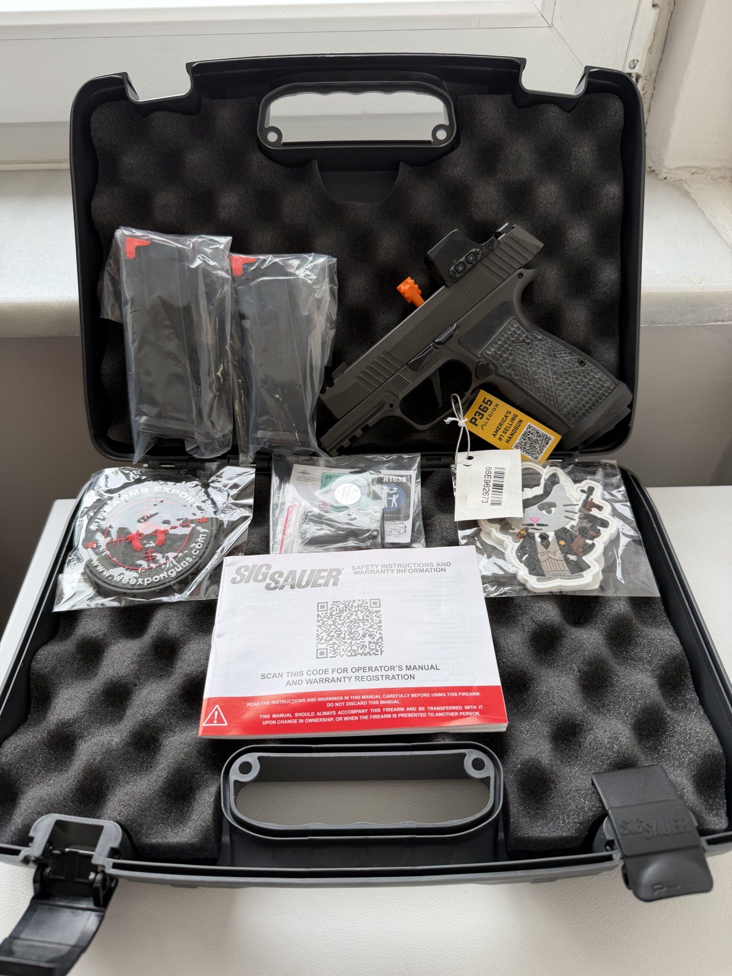 Silah Sig Sauer Marka P365 AXG Legion 9 mm orijinal romeo-x gündüz-gece görüşlü reddotlu modeldir. 3 adet 17 fişek kapasiteli şarjörü vardır.