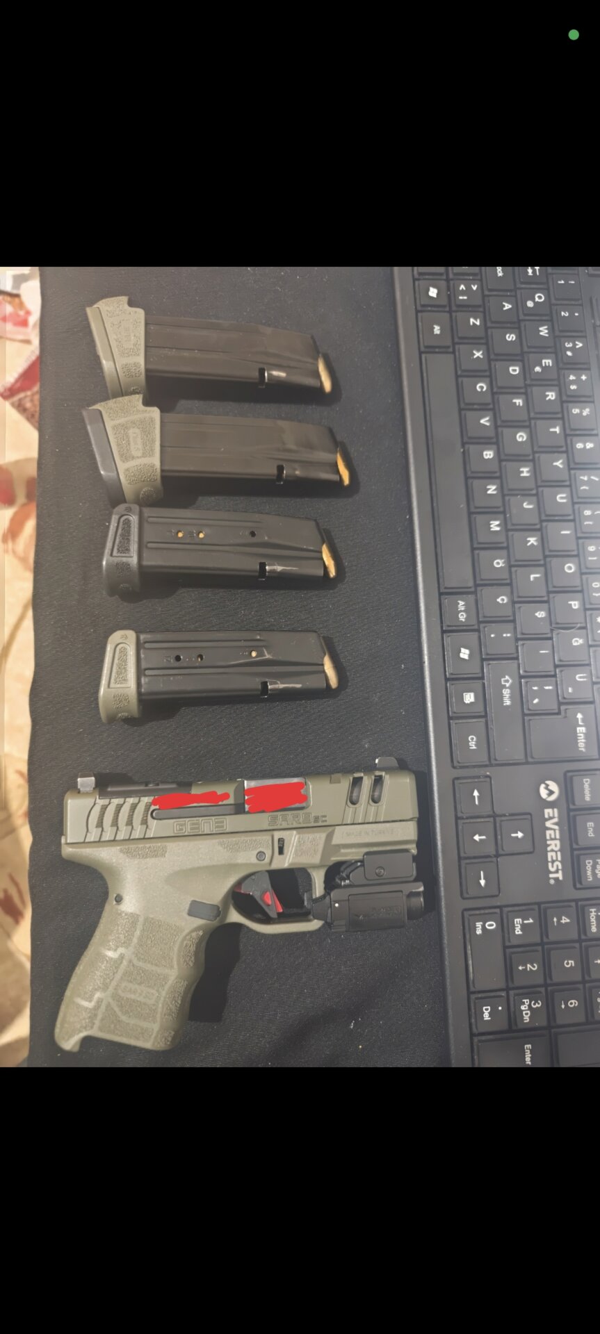Temiz sorunsuz Sarsılmaz SAR 9 SC GEN 3 modeli yanında olight ol mini 3 walkyrıs modeli fener verilecektir 4 âdet şarjör mevcuttur 2 âdet 12 li 1 adet 15 li 1 adet 17 li şarjörleri hepsi dolu verilecektir. Boş muhabbet için birbirimizi yormalayim şimdiden teşekkürler.